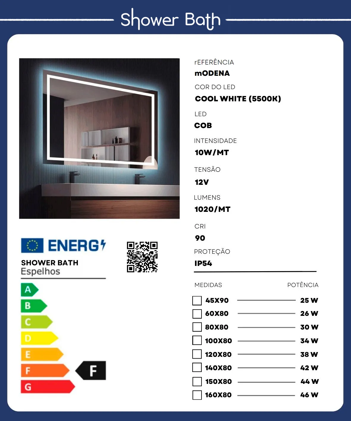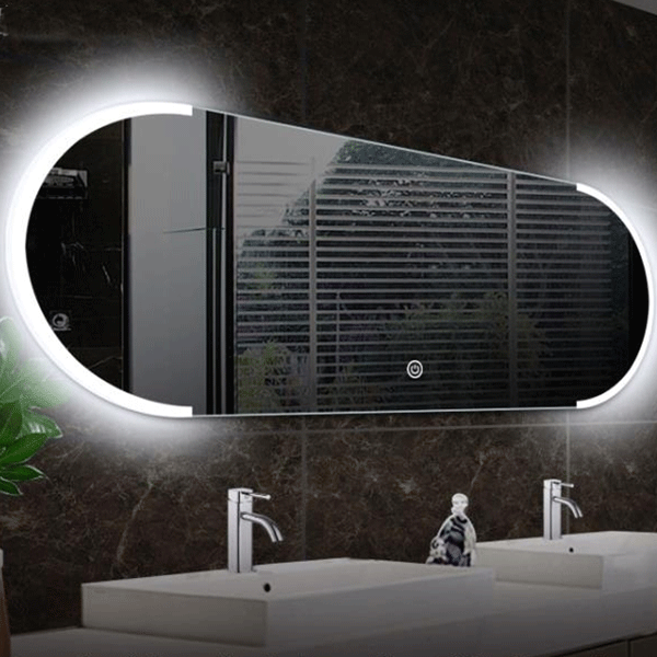 Espelho retangular com iluminação LED foscada frontal, disponível em várias dimensões (60×80, 80×80, 100×80 e 120×80 cm). Inclui controlo tátil, opção de luz fria (6000K) ou quente (3000K) e função desembaciadora.